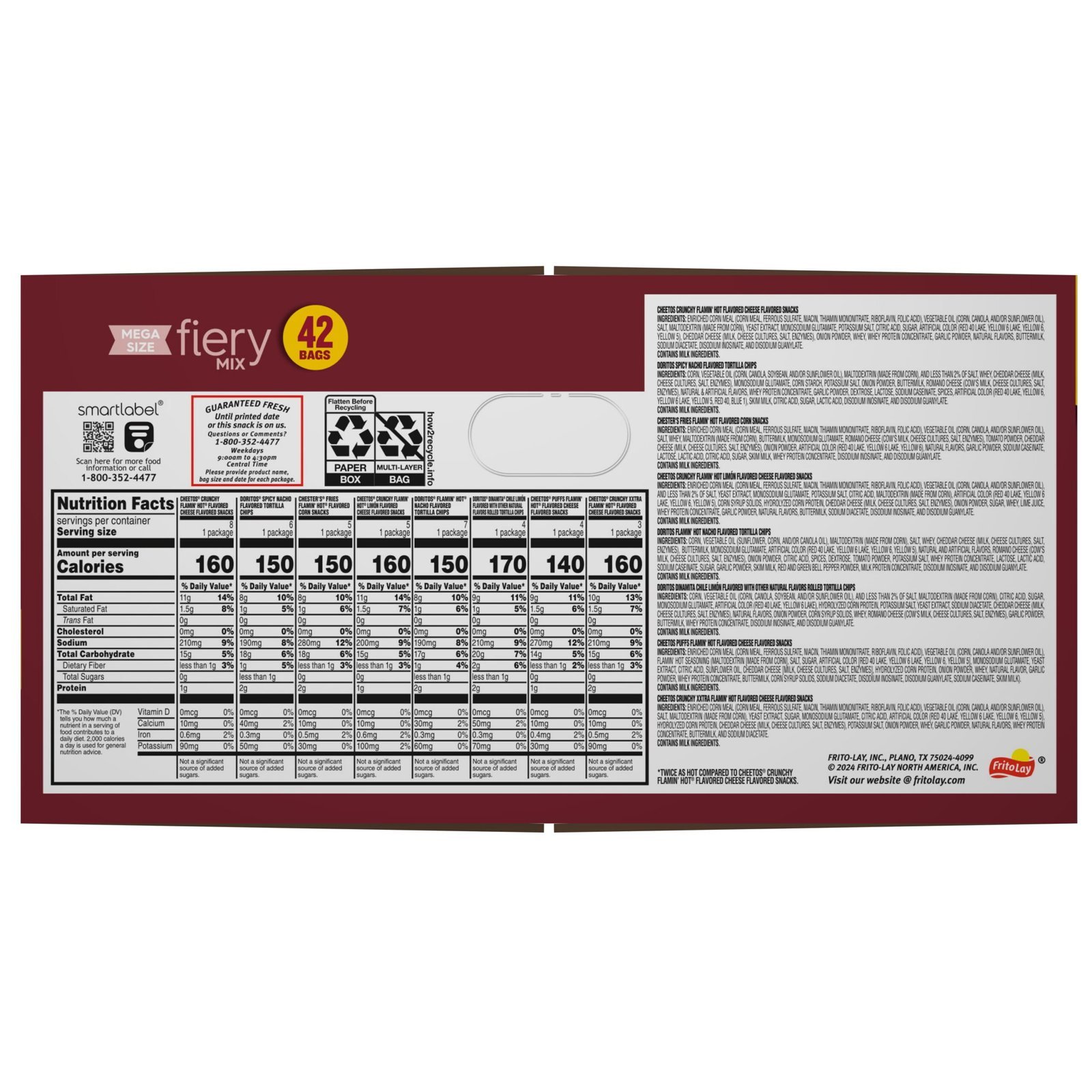 - 42 Count Mix includes: 8 CHEETOS® Crunchy FLAMIN’ HOT® Cheese Flavored Snacks, 5 CHESTER’S® Fries FLAMIN’ HOT® Flavored Corn Snacks, 7 DORITOS® FLAMIN’ HOT® Nacho Cheese Tortilla Chips, 4 CHEETOS® Puffs FLAMIN’ HOT® Cheese Flavored Snacks, 6 DORITOS® Spicy Nacho Flavored Tortilla Chips, 5 CHEETOS® Crunchy FLAMIN’ HOT® Limon Cheese Flavored Snacks, 4 DORITOS® DINAMITA® Chile Limon Flavored Rolled Tortilla Chips, 3 CHEETOS® Crunchy XXTRA FLAMIN’ HOT® Cheese Flavored Snacks